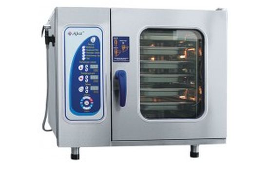 Пароконвектомат предназначен для приготовления различных блюд методом обработки паром и горячим воздухом по отдельности или комбинировано.Способ образования пара-парогенератор, 6 уровней GN 1/1(325х530 мм), 5 режимов приготовления, вся нерж., электрон.ПУ, душ, щуп, без гастроемкостей, дверца духовки 'свободные руки' и вентилируемая, 9,5 кВт, 380В, макс.темп. 270С , 116 кг,(гастроемкости в комплект не входят)