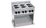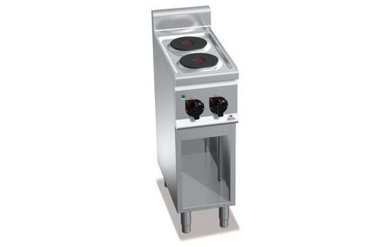 Открытый шкаф, круглые конфорки. Рабочий стол и передние панели из нержавеющей стали AISI 304. Цельноштампованная герметичная поверхность. Чугунные пластины с предохранительным термостатом и 6-позиционным переключателем, подключающим 6 концентрических зон мощности. Датчики контроля напряжения и рабочего состояния. Регулируемые ножки.