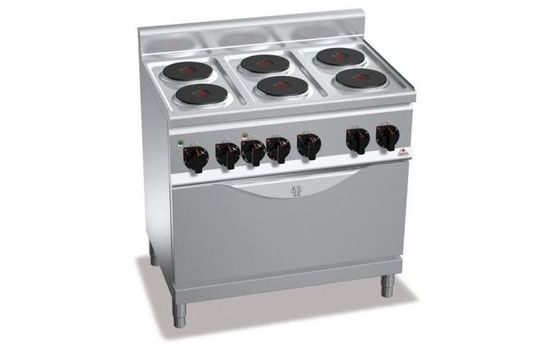 Духовой электрический шкаф с конвекцией мощностью 5,2кВт, круглые конфорки. Рабочий стол и передние панели из нержавеющей стали AISI 304. Цельноштампованная герметичная поверхность. Чугунные пластины с предохранительным термостатом и 6-позиционным переключателем, подключающим 6 концентрических зон мощности. Датчики контроля напряжения и рабочего состояния. Электрическая конвекционная печь с 2 двигателями, полностью из нержавеющей стали с опорами 4 уровней. Линейный датчик и датчик достижения температуры. Дверь и противодверь из нержавеющей стали. Высокопрочная ручка из нержавеющей стали толщиной 20/10. Регулируемые ножки. Стандарт: 1 шт. решетка для печи с системой против опрокидывания.