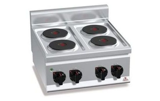 Круглые конфорки. Рабочий стол и передние панели из нержавеющей стали AISI 304. Цельноштампованная герметичная поверхность. Чугунные пластины с предохранительным термостатом и 6-позиционным переключателем, подключающим 6 концентрических зон мощности. Датчики контроля напряжения и рабочего состояния.