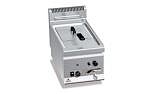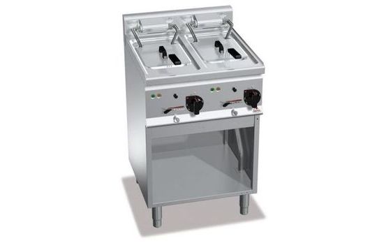 2 ванны по 10 литров. Стол для емкости из нержавеющей стали AISI 304. Две штампованные закругленные емкости с независимым управлением и специальными закругленными ТЭНами из нержавеющей стали сплава инколой с повышенным сроком службы, которые могут достигать в кратчайшее время рабочей температуры, позволяя сократить расход масла на 60%. Система жарки, сохраняя неизменными органолептические свойства масла, позволяет приготовлять качественную пищу, сократив количество смен масла, что в итоге приводит к существенной экономии. Вращение ТЭНа облегчает операции чистки. Контроль температуры с помощью регулируемого термостата до 190°C и предохранительного термостата с ручным включением. Среднее время жарки 5 минут. Предварительный разогрев 6 минут (от 20 до 190°C). Максимальная производительность 50 кг/ч (E6F10-6B, E6F10-6M), 60 кг/ч (E6F10-6BS, E6F10-6MS). Регулируемые ножки.