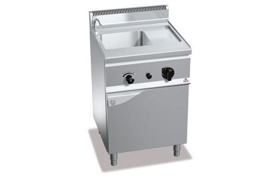1 корзина 30 литров. Рабочий стол и передние панели из нержавеющей стали AISI 304. Штампованная емкость с высокими закругленными бортами, полностью изготовленная из нержавеющей стали AISI 316. Полезный объем емкости 30 литров. Циркуляция воды обеспечивается днищем с отверстиями, которое отделяет корзины от днища емкости. Слив при переполнении большого размера для удаления избытков крахмала во время варки. Сливной шаровой кран, расположенный внутри емкости, управляемый с помощью ненагревающейся ручки. Другие возможности, обеспечиваемые системой разогрева, которая охватывает снаружи всю поверхность емкости. Пьезоэлектрическое включение с защитой из силикона. Регулируемые ножки. Стандарт: 1P ручка со штампованной ручкой толщиной 20/10.