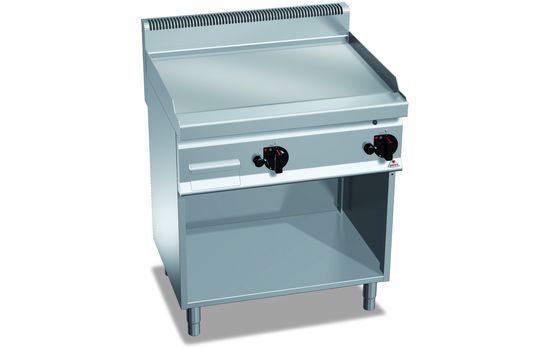 Площадь поверхности 4000см2, открытый шкаф. Рабочая поверхность и фронтальные и боковые панели из нержавеющеи? стали AISI 304. Трубчатые горелки с самостабилизирующимся огнем большои? площади для большеи? однородности распределения жара. Регулировка мощности производится постоянно работающим краном. Пилотныи? огонь и предохранительныи? клапан, оснащенныи? термопарои?. Пьезоэлектрическии? поджиг с силиконовои? защитои?. Максимальная контролируемая температура до 300°C. Гладкая конфорка с облицовкои? твердым хромом, проволочнои? защитои? от брызг, блестящеи? легко очищаемои? поверхностью, низким уровнем излучения тепла, что обеспечивает большии? комфорт оператору. Две зоны с отдельными панелями управления и приводом для независимои? регулировки и достижения оптимальнои? температуры. Особенно рекомендуется для деликатнои? готовки. Слегка наклоненная варочная поверхность с крупным сливным отверстием и транспортер в герметичном контеи?нере. Регулируемые ножки.
