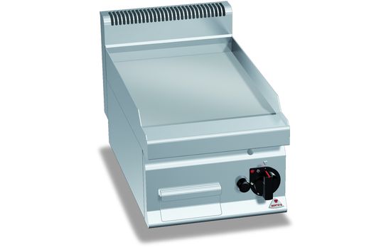 Площадь поверхности 2000см2. Рабочая поверхность и фронтальные панели из нержавеющеи? стали AISI 304. Трубчатые горелки с самостабилизирующимся огнем большои? площади для большеи? однородности распределения жара. Регулировка мощности производится постоянно работающим краном. Пилотныи? огонь и предохранительныи? клапан, оснащенныи? термопарои?. Пьезоэлектрическии? поджиг с силиконовои? защитои?. Максимальная контролируемая температура до 300°C. Гладкая конфорка с облицовкои? твердым хромом, проволочнои? защитои? от брызг, блестящеи? легко очищаемои? поверхностью, низким уровнем излучения тепла, что обеспечивает большии? комфорт оператору. Слегка наклоненная варочная поверхность с крупным сливным отверстием и транспортер в герметично удерживающем жидкости контеи?нере. Особенно рекомендуется для деликатнои? готовки.