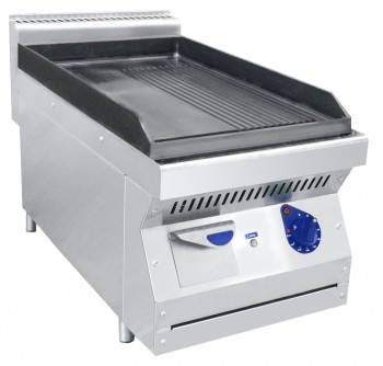 1/2 - гладкая поверхность,1/2 - рифлёная поверхность. Аппарат контактной обработки (жарочная поверхность) предназначен для приготовления таких блюд, как: стейк, рыба, блины или омлет, путем непосредственного контакта греющей поверхности с пищей. Устанавливается на подставку. Имеет плавную регулировку температуры жарочной поверхности от 30 до 300 С. Площадь жарочной поверхности 0,22м2. На лицевой панели расположены лотки для сбора масла. Поверхность для жарки имеет желоб для стекания жидкости и бортиком по периметру, предотвращающий разбрызгивание жира.