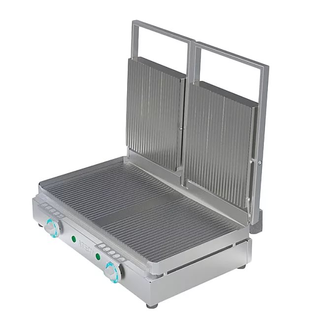 Гриль контактный прижимной для жарки мясных подуктов, рыбы, овощей, а так же для приготовления гамбургеров и хот-догов. Верхние и нижняя поверхности - рифленые. Размер верхней рабочей поверхности 250х218мм. Размер нижней рабочей поверхности 510х280ммм. Время разогрева до +200°С - 15мин. Для удобства использования предусмотрены: терморегулятор, трехсторонний бортик и фиксаторы верхних поверхностей в открытом состоянии. Корпус выполнен из пищевой нержавеющей стали, жарочная поверхность - из углеродистой стали. В комплекте съемный поддон и скребок для очистки поверхностей.
