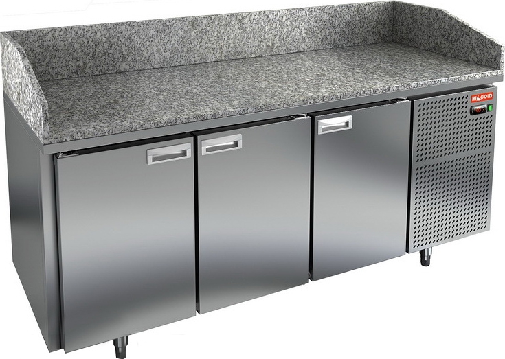 Столы для пиццы аналогичны по конструкции саладеттам и отличаются тем, что заготовки пиццы хранятся в охлаждаемом объеме в выдвижных ящиках. Мощность электрическая: 0,53кВт, Общий объем: 395л, .(+2+10), 3 двери, 1835х700х850мм, глубина раб.пов. 324мм
