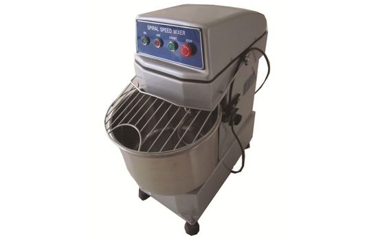 Спиральная тестомесильная машина, 1-скоростной двигатель, фиксированная дежа из нерж.стали емкостью 20 л, крюк для теста, разовый замес до 8 кг.