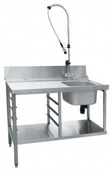 СПМП-6-3 - предмоечный стол, имеет цельнотянутую ванну 400х400х250 мм для предварительного ополаскивания посуды. Выполнен полностью из нержавеющей стали. Для усиления конструкции стол имеет обвязку по четырем сторонам. Конфигурация позволяет как в левое, так и правое исполнение. Регулируемые по высоте ножки.