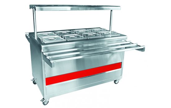 Используется в передвижной линии самообслуживания для непродолжительного сохранения первых и вторых блюд в гастроёмкостях в горячем состоянии, а также для раздачи их потребителям. За счет поворотных колес со стопорным механизмом, мармит применяется при организации питания в гостиницах, ресторанах и буфетах. Также мармит удобен для «шведских столов». Гастроемкости обогреваются горячим паром, который поступает от двух ТЭНов, размещенных под ванной. Мармит оснащен плавной регулировкой температуры в диапазоне от 30 до 85 °С. Ванна со сливом мармита легко поддается гигиенической чистке и обслуживанию. Может изготавливаться из 'кашированного' (декорированного под дерево) металла. Цена изделия из 'кашированного' металла аналогична цене изделия из нержавеющей стали.