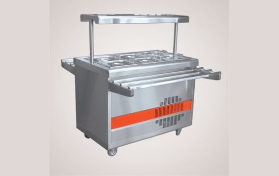 Используется в передвижной линии раздачи для нескольких задач: демонстрация и раздача холодных закусок, третьих блюд и охлажденных напитков потребителям, а также их хранение при заданной температуре. Температура прилавка холодильного плавно регулируется в диапазоне от 1 до 10 °С. За счет поворотных колес со стопорным механизмом, прилавок холодильный применяется при организации «мобильного» питания в гостиницах, ресторанах и буфетах. Также прилавок холодильный удобен для «шведских столов». Может изготавливаться из 'кашированного' (декорированного под дерево) металла. Цена изделия из 'кашированного' металла аналогична цене изделия из нержавеющей стали.