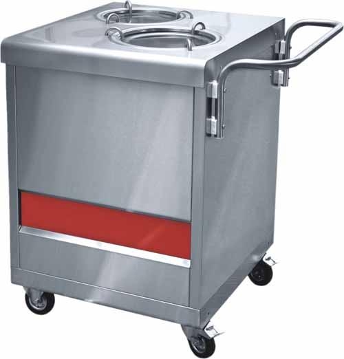 Прилавок-диспенсер тарелок подогреваемый передвижной с 2 цилиндрами, на закрытом стенде с 1 дверцей предназначен для транспортировки, подогрева и раздачи тарелок для первых и вторых блюд. Рабочая температура - +30С (для верхних тарелок), +60С (для нижних тарелок). Максимальная загрузка - 2х40 тарелок диаметром 200/240мм. Расход эл.энергии на поддержание температуры тарелок +60С - 300Вт/ч. Время разогрева тарелок - 50мин. Количество ТЭНов - 2шт. Пружинный механизм подъема тарелок обеспечивает наличие верхних тарелок на уровне столешницы. Сбоку располагается ручка для транспортировки. Поворотные колёса имеют стопор. Прилавок выполнен из нержавеющей стали и имеет дизайн линии раздачи Аста. Длина с выступающей ручкой 823мм. Может изготавливаться из 'кашированного' (декорированного под дерево) металла. Цена изделия из 'кашированного' металла аналогична цене изделия из нержавеющей стали.