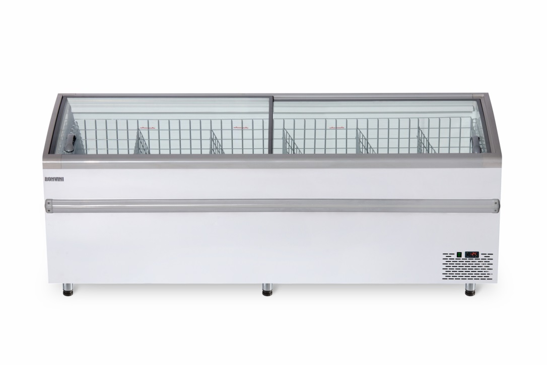 Морозильная бонета BONVINI BFG 2500 с гнутой панорамной сдвижной крышкой и встроенным агрегатом. В комбинации с торцевой бонетой BFG 1850 может быть составлена островная крнструкция. Цвет пластиковой окантовки серый. Температурный режим +10 до 0…..-18 до -25. Компрессор NT2192GK. Хладогент R404A. Общий объем 1120 л. Полезный объем 935 л. Корпус - металл оцинк. с полимерным покрытием. Внутренняя камера - металл оцинк. с полим. покрытием. Регулируемые опоры или колеса - 6 шт. Испаритель - трубка - 8*0,7 мм. Конденсатор - Медный с алюминиевыми ламелями. Тип размораживания - горячим газом. Регулировка - электронный контролер. Закаленное стекло Pilkington. Защита 'спина к спине'.