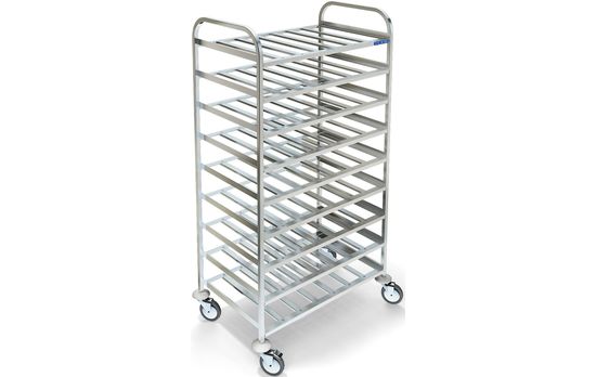 Цельносваренная конструкция, полностью из нержавеющей стали марки AISI 304. Стойки из нержавеющего профиля 20х20 мм, обрезиненные поворотные колёса диаметром 100 мм (два колеса с тормозом и пластиковым отбойником). Используются для сбора и транспортировки подносов с грязной посудой. 9 уровней. Вместимость 18 подносов.