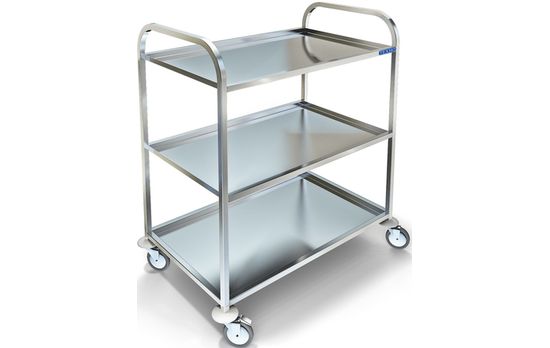 Тележка изготовлена из металлической квадратной трубы. Каркас разборный из нержавеющей стали AISI 304, полка из нержавеющей стали AISI 304, три уровня. Оборудована колесами с тормозным устройством.