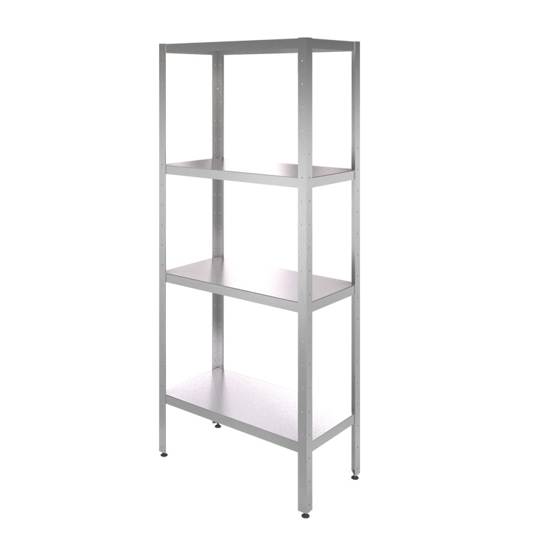 Сборно-разборная конструкция. Нержавеющая сталь AISI 430 толщиной 1 мм. Сплошные полки, усиленные ребрами жесткости, переставляемые по высоте (в комплекте 4шт). Нагрузка на полку до 60 кг. В качестве опор используется профильная труба 20*40 мм. Ножки оснащены регулируемыми по высоте опорами, позволяющими компенсировать неровности пола.