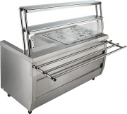 Мармит универсальный, 1 и 2 блюд 3МЭП-У-15/7Н с двухъярусной полкой, на которой размещаются порционные блюда. 1 конфорка. Регулируемая температура нагрева +30…+80С. Рабочая зона отделена от посетителей перегородкой из стекла. Мармит комплектуется гастроёмкостями: GN-1/1-150 - 1 шт., GN-1/2-150 - 2 шт., GN-1/4-150 - 2 шт. и направляющими для подносов. Подсветка. Инвентарный шкаф с дверьми-купе. Регулируемые по высоте ножки.