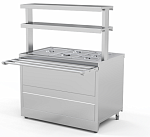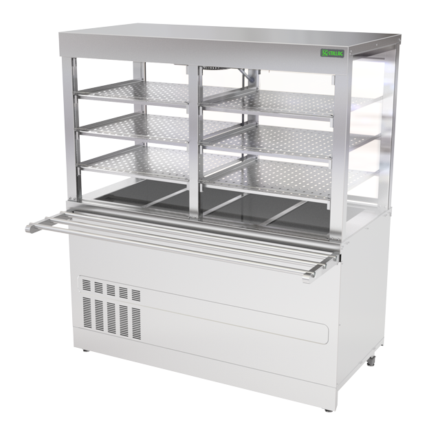 Витрина тепловая. Предназначена для оперативного хранения, демонстрации и раздачи в подогретом состоянии хлебобулочных изделий и прочего. Модуль оснащен регулятором температуры, встроенной подсветкой. Модуль оснащен удобными дверцами со стороны посетителей и обслуживающего персонала. Дверцы обеспечивают доступ, как к выставляемым продуктам, так и упрощают выкладку продуктов. Внизу расположена нейтральная полка. В комплектацию входят направляющие для подносов. Материал: нержавеющая сталь.