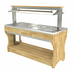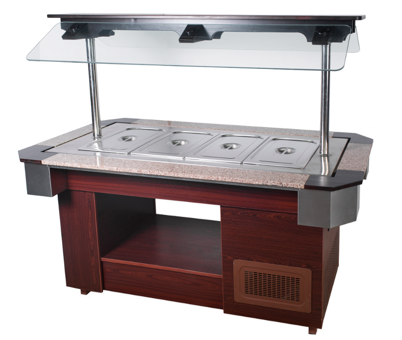 Охлаждаемый салат-бар. Предназначен для демонстрации и кратковременного хранения блюд в температурном диапазоне от +2 до +10°С. Материал корпуса – дерево и натуральный камень. В комплекте 4 гастроемкости, выполненные из нержавеющей стали – AISI 304. Встроенная подсветка (2 лампы), регулируемые по высоте до 20мм ножки.