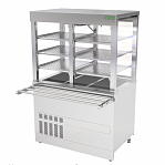 Витрина с охлаждаемой столешницей. Предназначена для оперативного хранения, демонстрации и раздачи холодных закусок и охлажденных напитков потребителю. Модуль оснащен системой контроля температуры, встроенной подсветкой, системой циркуляции воздуха. Модуль оснащен удобными дверцами со стороны посетителей и обслуживающего персонала. Дверцы обеспечивают доступ, как к выставляемым продуктам, так и упрощают выкладку продуктов. Внизу расположена нейтральная полка. В комплектацию входят направляющие для подносов. Материал: нержавеющая сталь.
