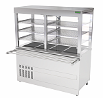 Нейтральный элемент линий раздачи. Применяется для оперативной подачи и хранения хлебобулочных, кондитерских изделий и прочего. Внизу открытый шкаф для хранения посуды и инвентаря. Модуль оборудован полкой со встроенной подсветкой. Оборудование имеет регулируемые по высоте ножки. Материал: нержавеющая сталь. Возможно размещение вспомогательного оборудования.