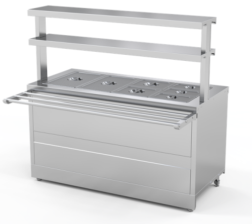 Мармит вторых блюд. Предназначен для оперативного хранения, демонстрации и раздачи в горячем виде вторых блюд в гастроемкостях. Для подогрева используется сухой воздух. Диапазон регулирования температуры 30-80С. Материал: нержавеющая сталь. Комплектация: направляющие для подносов; полка 2-ярусная; два светильника; гастроемкости с крышками GN1/1 — 2шт; GN1/2 — 2шт; GN1/3 — 3шт; внизу нейтральный шкаф с полками и распашными дверцами. Ножки регулируются по высоте в пределах 20мм. Плавная поступательная регулировка мощности.